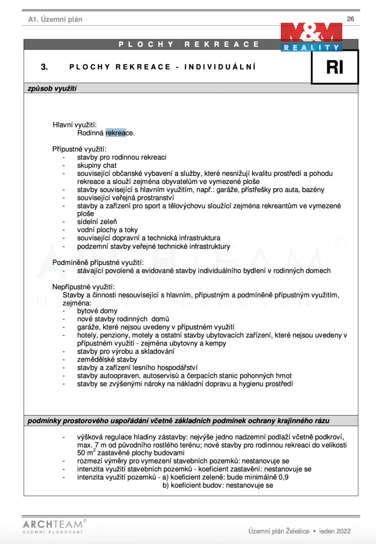 Dle územního plánu je zde možnost výstavby rekreačního objektu, díky čemuž je pozemek ideální pro vybudování víkendové chaty, zázemí pro rodinnou rekreaci nebo kombinaci odpočinku a zahradničení.