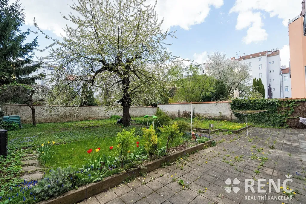 Spolu s bytem je možné užívat také dvůr a zahradu domu. Součástí prodeje je podíl na pozemku pod budovou a rovněž podíl na zahradě a dvorku o výměře 230 m². V suterénu domu je k dispozici také společná místnost pro uložení kol a dalšího vybavení o ploše 35 m2.