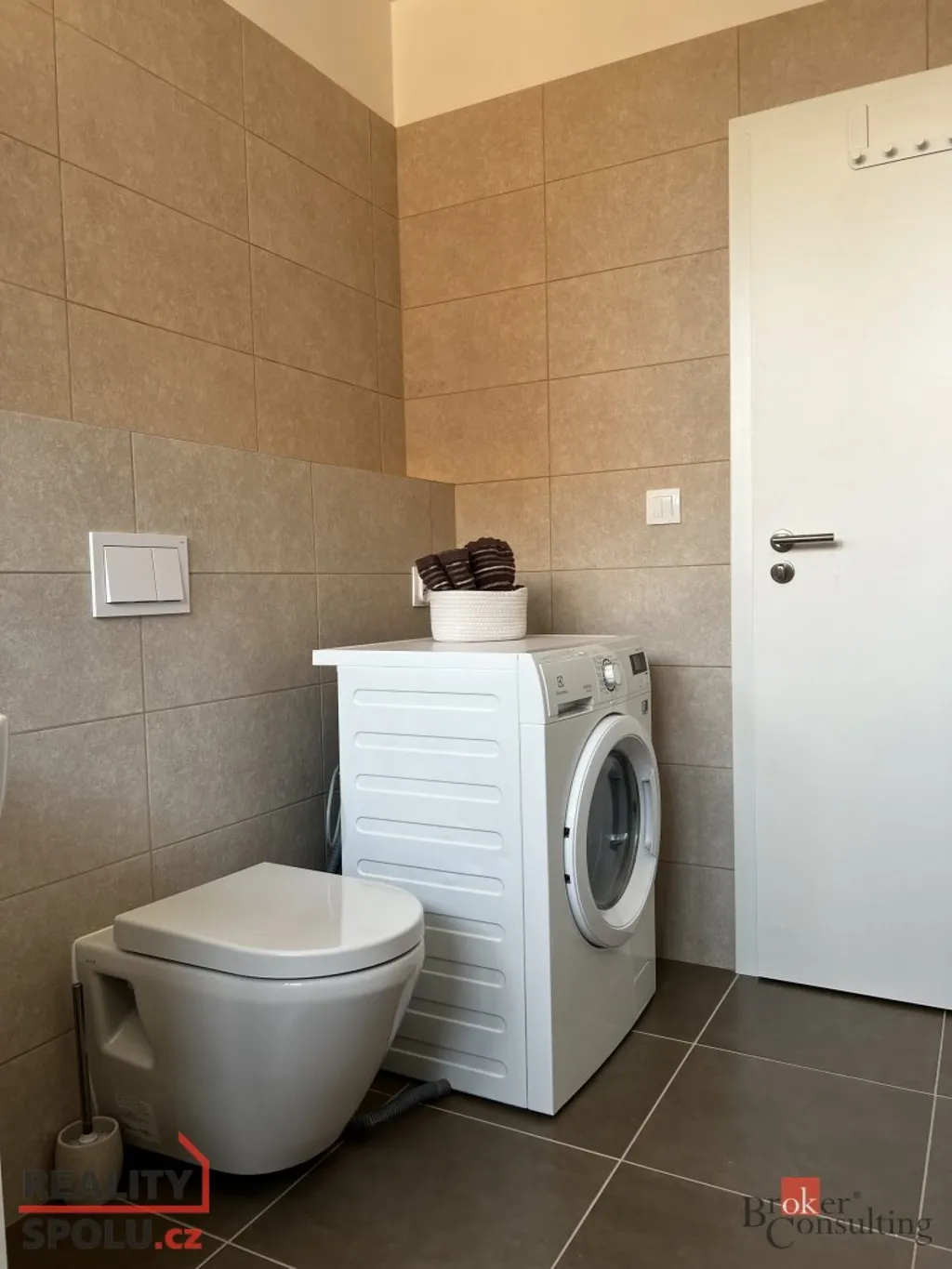 Koupelna je vybavena také pračkou se sušičkou.