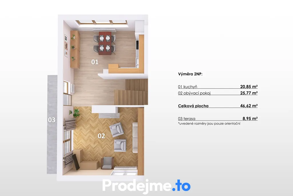 První patro je společenským srdcem domu. Najdete zde obývací pokoj s krbem pro dlouhé zimní večery a kuchyni s jídelním stolem. Z obývacího pokoje i přímo z chodby můžete pohodlně projít na prostornou a zastřešenou terasu.