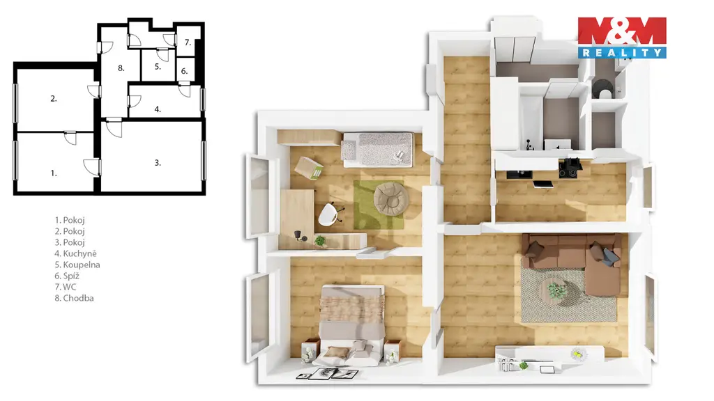 Tento byt spojuje klidné bydlení s výbornou dopravní dostupností a veškerým komfortem města.