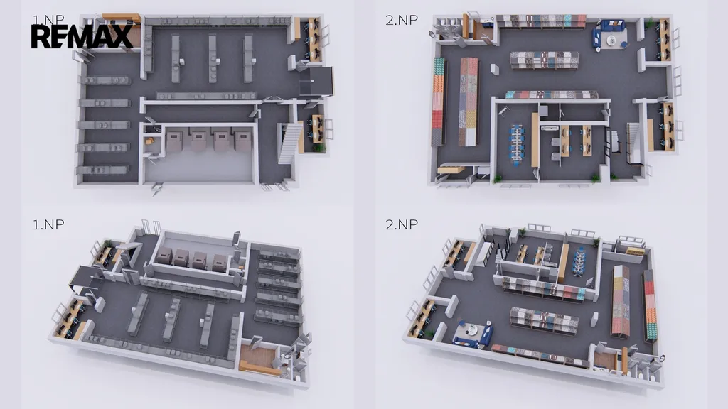 2. NP (364 m²) – hlavní obchodní prostor doplněný kancelářemi, skladem, sociálním zázemím a kuchyňkou