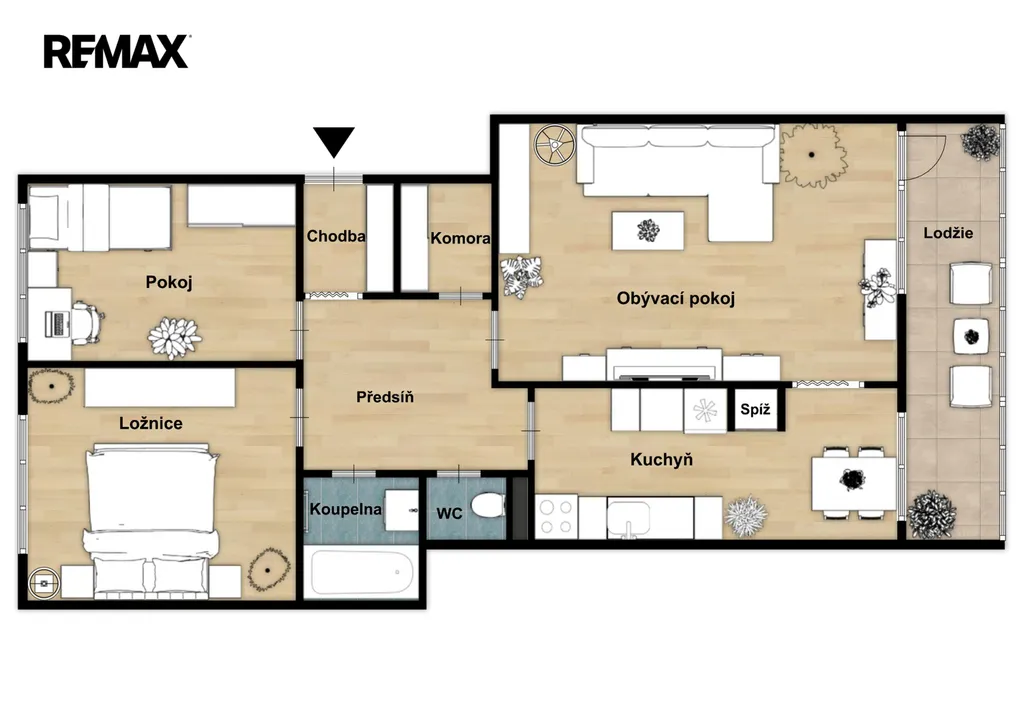 Výhodné je i rohové umístění, byt je příjemně světlý po celý den. Obývací pokoj s lodžií je orientovaný na jih, takže do něj proudí slunce většinu dne. Dvě ložnice na sever pak zajišťují klid a příjemné podmínky na spaní. Díky tomu, že má byt pouze jednoho přímého souseda, je tichý a nabízí více soukromí.