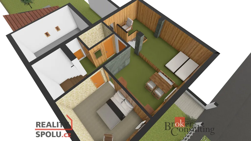 Ve zvýšeném přízemí domu se nachází kuchyně, koupelna a dva pokoje. V mezipatře je malá klidová zóna s pohovkou.
