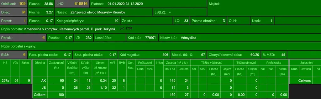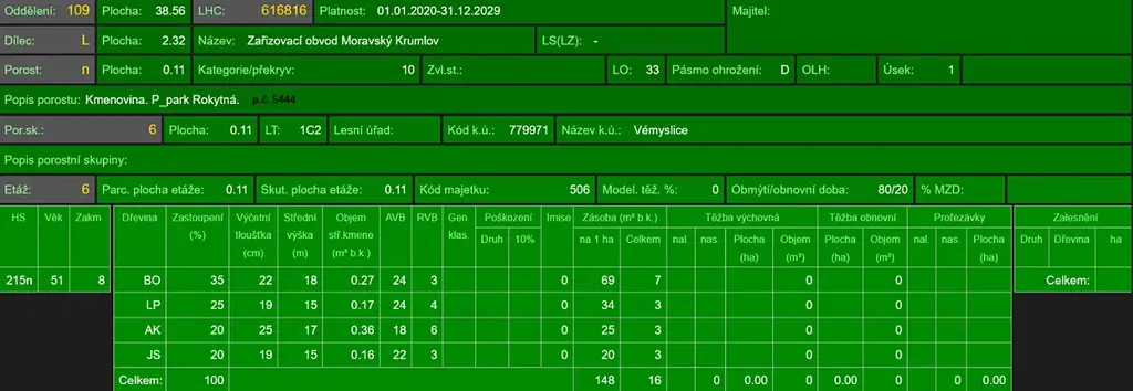 - p.č. 5444 vedená jako lesní pozemek o celkové výměře 1 119 m2 (stáří lesa 57 let - zastoupení dřevin borovice, lípa, akát, jasan),