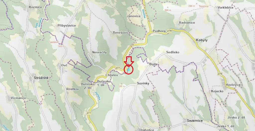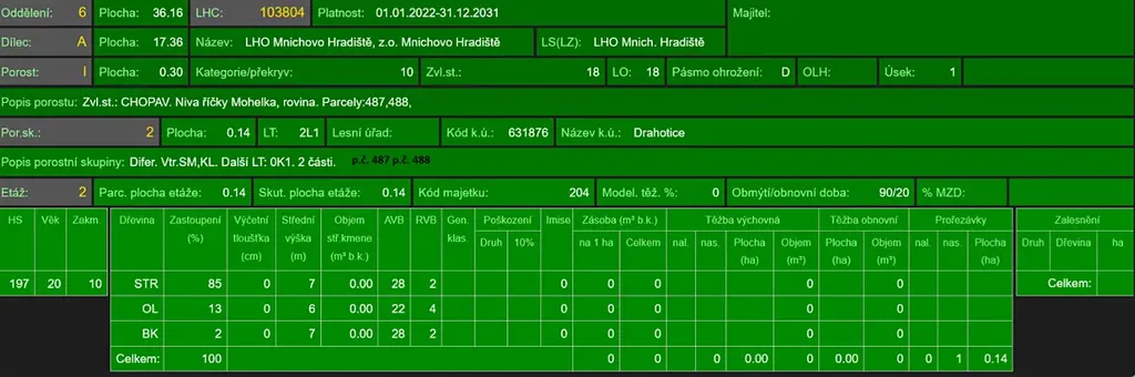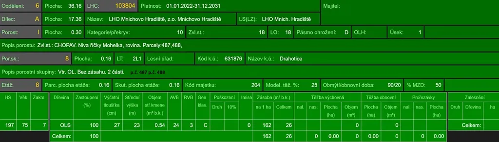 - p.č. 488 vedená jako lesní pozemek o celkové výměře 1 140 m2 (stáří lesa 79 let - zastoupení dřevin olše, stáří lesa 24 let - zastoupení dřevin střemcha, olše, buk).