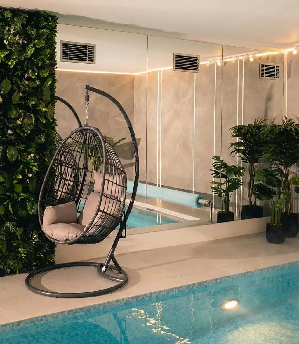 - hlavní relaxační prostor s bazénem, posezením, lehátky a kuchyňským koutem s barovou zónou,