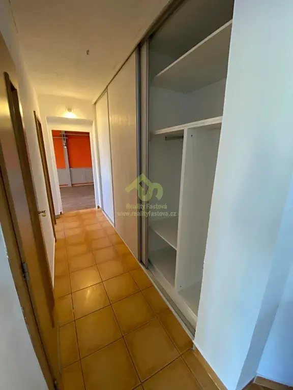 V chodbě bytu je zbudovaná na míru obrovská šatní skříň s posuvnými dveřmi. Při vstupu do bytu je po levé straně samostatný pokoj, který byl užíván jako dětský pokojík. Je zde policový a komodový úložný systém.