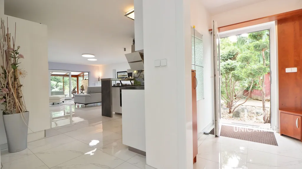 Dům typu bungalov se nachází ve vnitrobloku domu, kde je zajištěno klidné a soukromé bydlení zcela izolováno od venkovního ruchu. Po vjezdu přes elektrická vrata vás přivítá pozitivní prostředí, kde se kde se současnému majiteli podařilo dokonale propojit moderní technologie a komfort s přírodou.