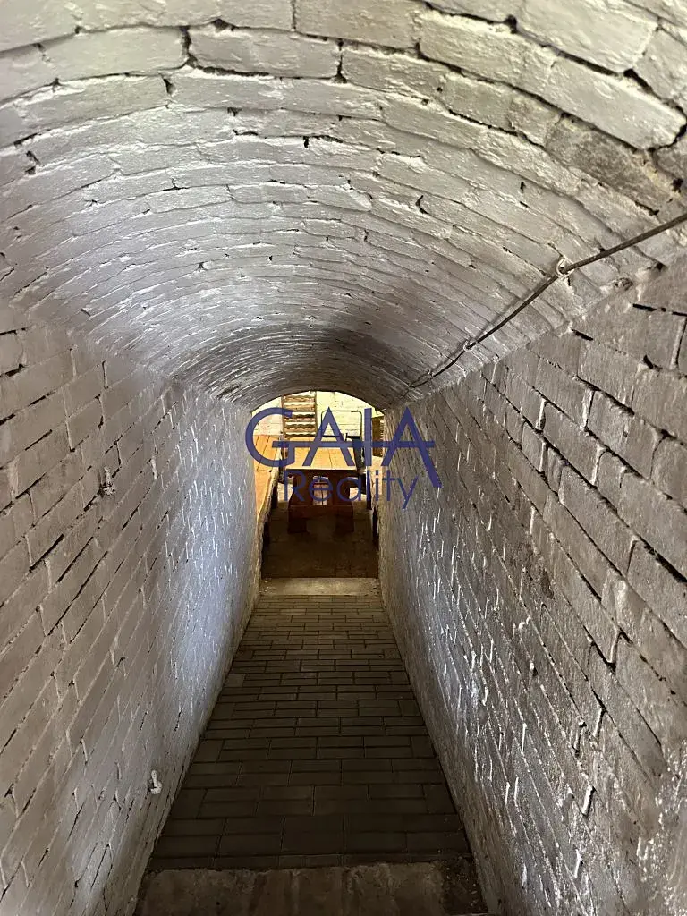 Přízemí sklepa tvoří zázemí s kuchyňským koutem a vstupem do vinného sklepa, který slouží nejen k uskladnění vína, ale i k příjemnému posezení u skleničky. Dále je zde menší pokoj s kamny na tuhá paliva, která zároveň zajišťují vytápění podkroví.