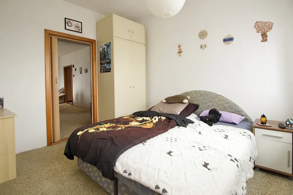 Byt je velmi dobře dispozičně řešen – nabízí dva neprůchozí pokoje, prostorný obývací pokoj, samostatnou kuchyň, koupelnu, WC a předsíň. Součástí je lodžie a sklepní kóje o velikosti 5 m2. K bytu náleží také samostatná garáž, která je více než 30 let užívána výhradně majitelem bytu a stojí na městském pozemku. Díky orientaci má byt dostatek denního světla po celý den.