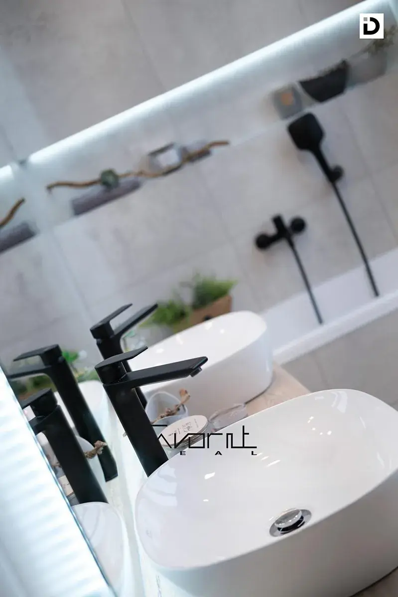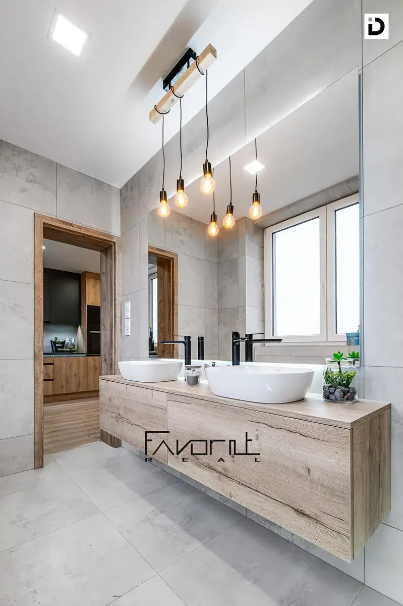 V koupelně velkoformátové obklady, dlažba, umyvadlo se skříňkou, baterie, zrcadlo, vana. WC je zvlášť.