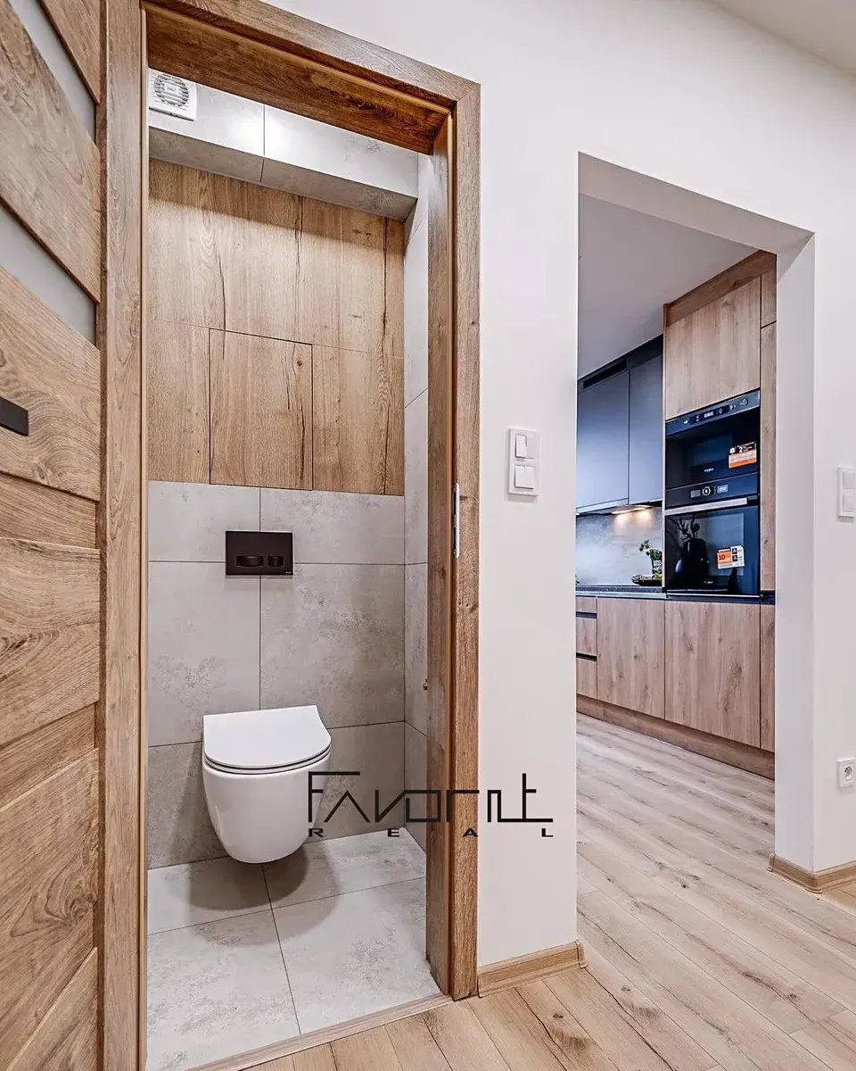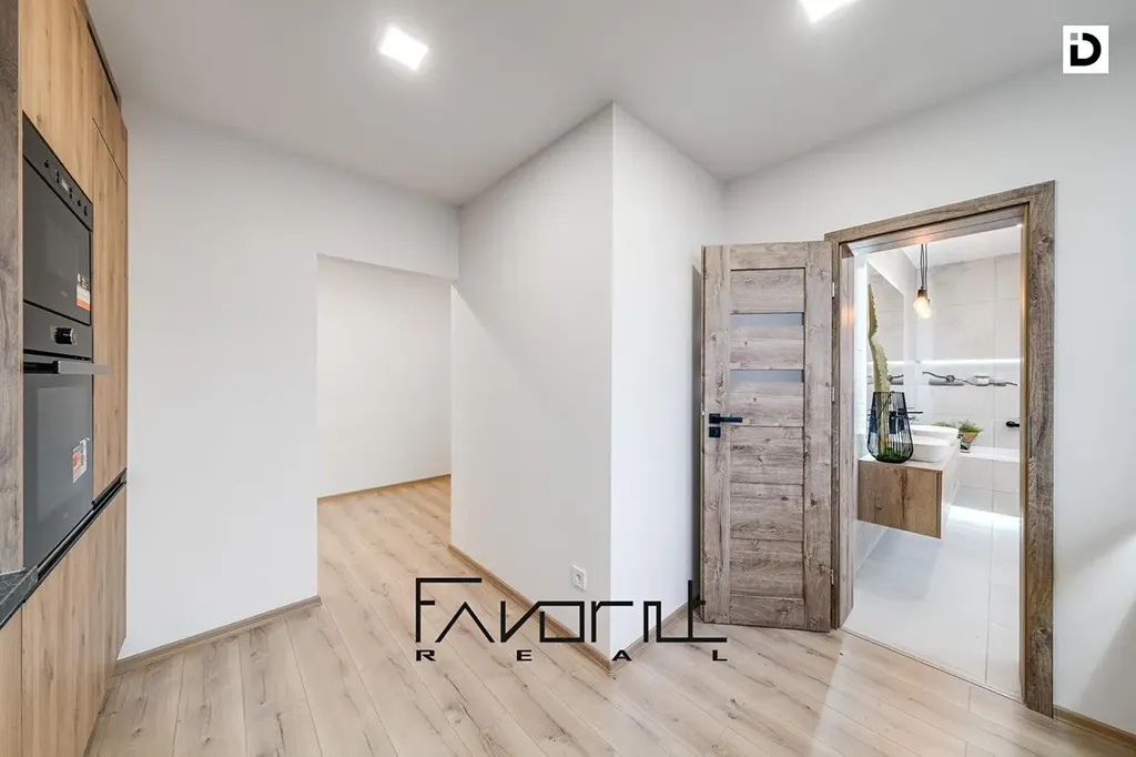 Nivelace podlah před položením plovoucí podlahy (srovnání). Barva podlahy v odstínu dřeva. Na podlahách jsou zátěžové plovoucí podlahy. Nové interiérové a vstupní dveře včetně obložek, vypínače a zásuvky. Nové kvalitní omítky.
