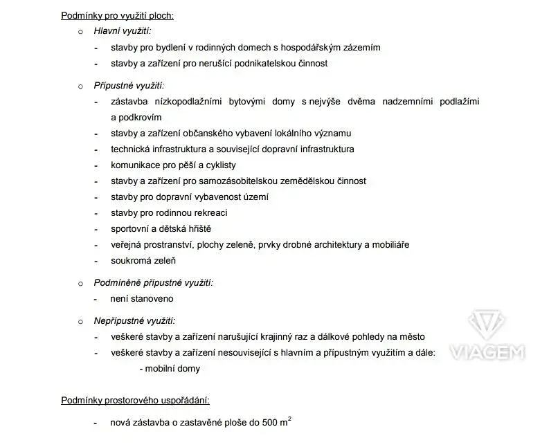 Dle regulativ územního plánu je pozemek určen k výstavbě rodinného domu. Podmínky prostorového uspořádání umožňují zástavbu o zastavěné ploše až 500 m². Mezi další přípustné využití patří stavby pro rodinnou rekreaci, bytové domy a stavby či zařízení pro zemědělskou činnost. Podrobné informace k regulativům naleznete v přiložené textové části územního plánu v galerii.