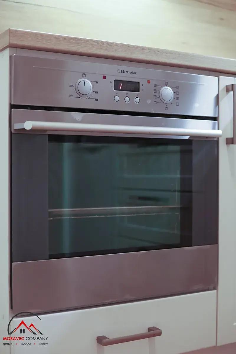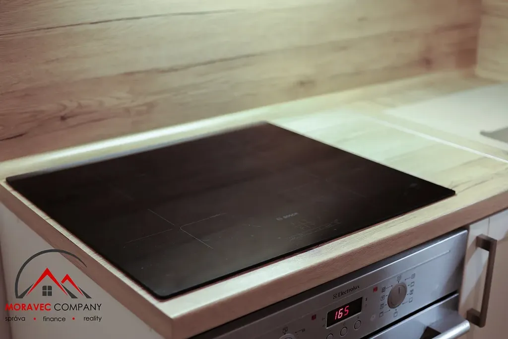 Moderní kuchyňská linka je vybavena troubou, indukční varnou deskou, myčkou a vestavěnou lednicí, v koupelně je vana a WC. Ohřev vody i vytápění zajišťuje úsporný kondenzační kotel, díky kterému máte své náklady plně pod kontrolou. K bytu náleží sklep, a užívání části zahrady.