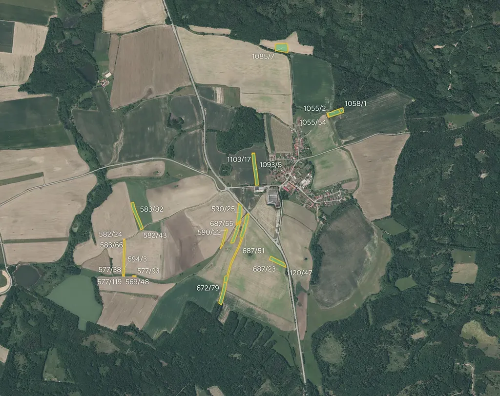 Předmětem prodeje jsou parcely č. 569/48, 577/38, 577/93, 577/119, 582/24, 582/43, 583/66, 583/82, 590/22, 590/25, 594/3, 672/9, 687/23, 687/51, 687/55, 1055/2, 1055/54, 1058/1, 1085/7, 1093/5, 1103/17 a 1120/47, a to o velikosti 100% podílu.