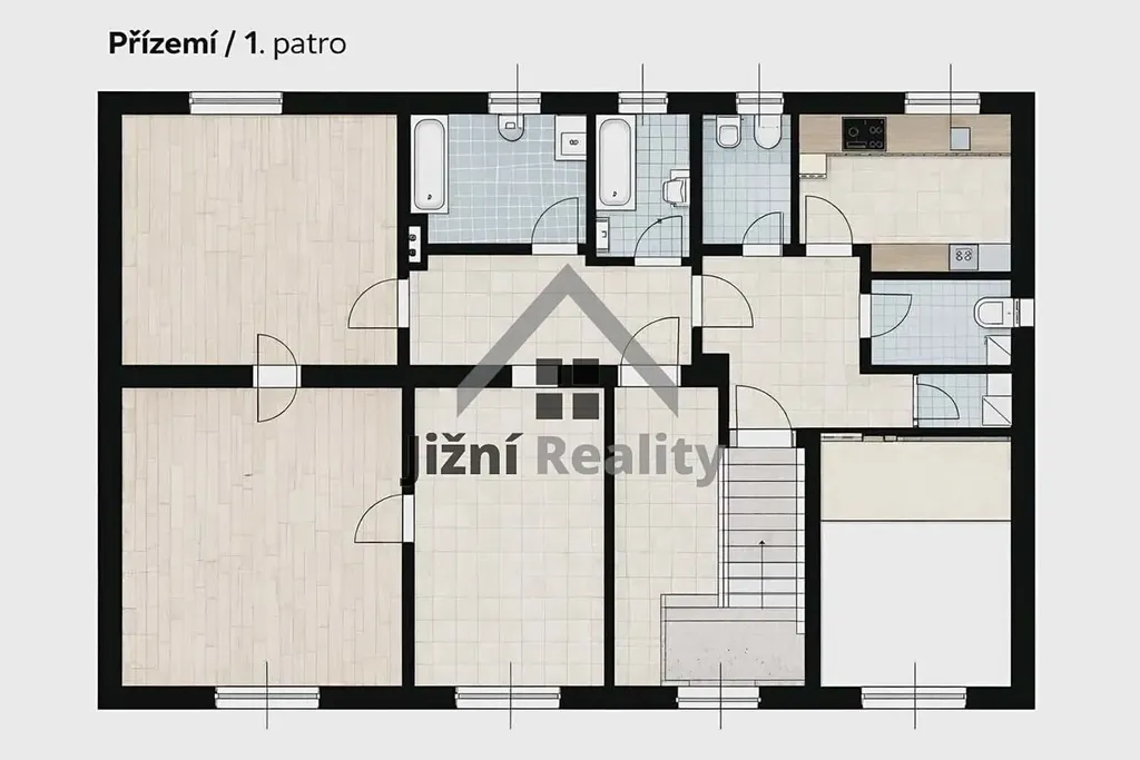 Ve druhém patře najdeme dalších pět pokojů a koupelnu se dvěma WC a šatník.