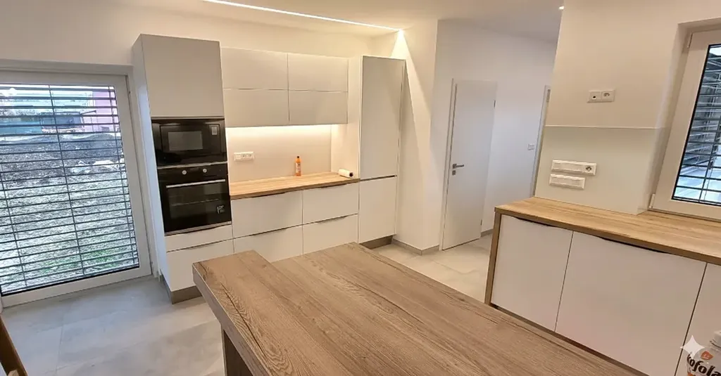Rodinný dům zkolaudovaný v r. 2022 je zděný, jednopodlažní s rovnou střechou, garáží pro 2 osobní automobily 36 m² a venkovním parkovacím stáním pro další 2 auta. Zastavěná plocha 209 m², podlahová plocha 173 m².