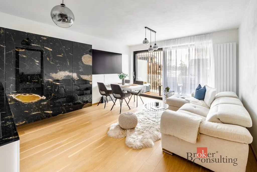 Interiér je kompletně zařízen prémiovým italským nábytkem značky Lago a kombinuje čisté linie s přírodními materiály. Dominantou obývací části je výrazná designová stěna, která prostoru dodává příjemnou atmosféru a podtrhuje jeho moderní a elegantní charakter. Ložnice je vybavena manželskou postelí a vestavěnými úložnými prostory. Vstupní část nabízí dostatek úložného prostoru a působí čistě i přehledně díky vestavěným prvkům a velkému zrcadlu.