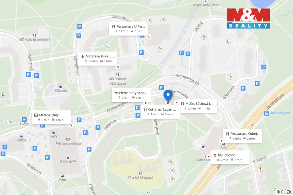 V okolí kompletní občanská vybavenost. Dostupnost do centra je ideálně metrem B a trvá cca 15 min.