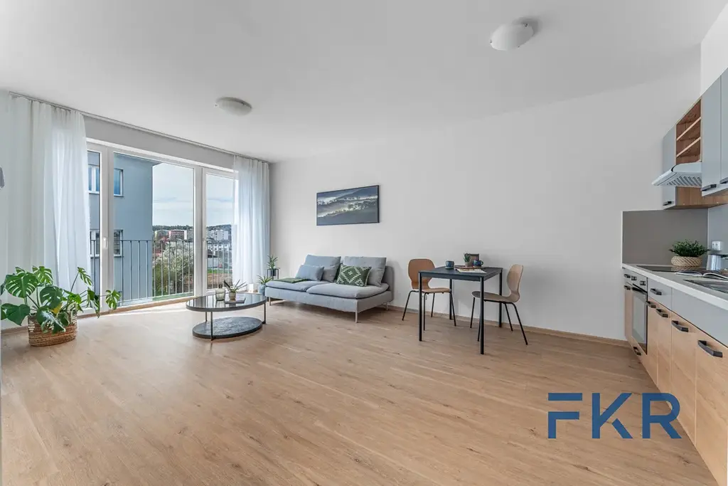 Moderní, účelný a světlý interiér těží především z promyšleného uspořádání pokojů a velkoformátových oken, která prostoru dodávají další rozměr. Podlahové vytápění eliminuje potřebu klasických radiátorů, což umožňuje snadnější rozmístění nábytku a maximální využití každého metru čtverečního. Balkon navazuje na obytnou část a přirozeně ji rozšiřuje o venkovní prostor.