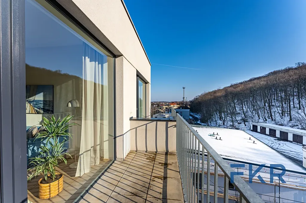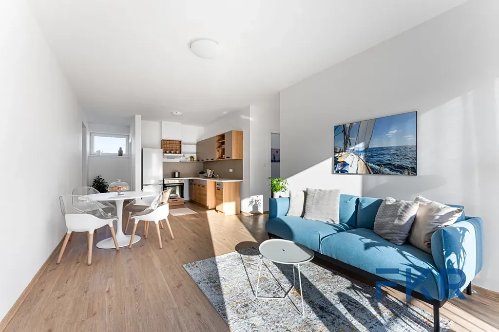 Účelný a světlý interiér těží především z rozumného uspořádání pokojů a velkoformátových oken, která prostoru dodávají další rozměr. Podlahové vytápění eliminuje potřebu klasických radiátorů, což umožňuje snadnější rozmístění nábytku a maximální využití každého metru čtverečního. Příjemným faktem je dvojice balkónů, které poskytují šikovný venkovní prostor.