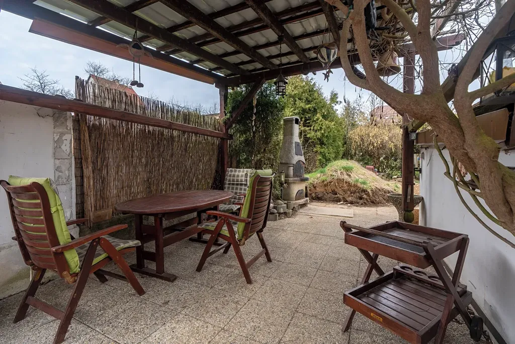 Celý dům je podsklepený. Za domem je zahrádka, pergola, která slouží k posezení i s venkovním krbem, dále bazén, který je momentálně zasypán.