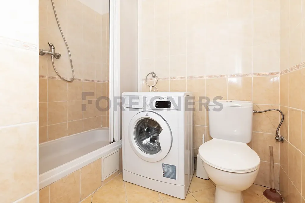Koupelna se sprchovým koutem je vybavena pračkou a toaletou.