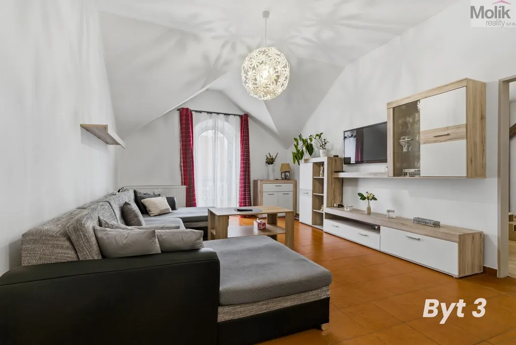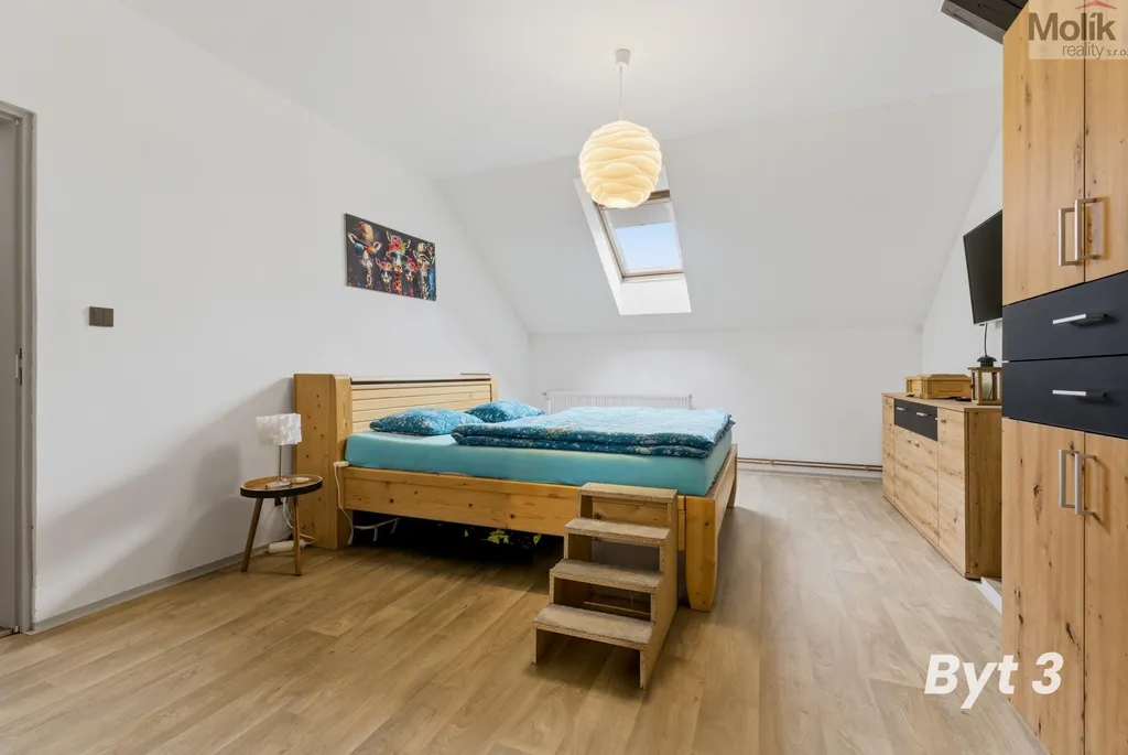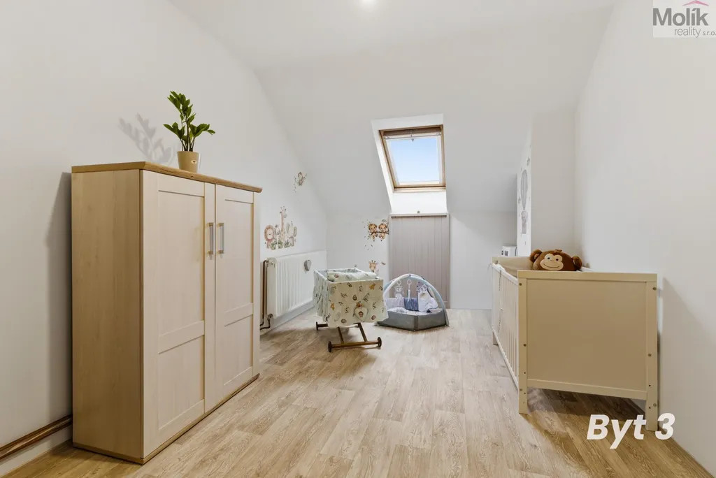 Ve 3. nadzemním podlaží (podkroví) se nachází bytová jednotka o dispozici 4+1 o výměře 115 m2 (na fotografii označen byt 3), kde jsou instalována dřevěná střešní okna Velux, vytápění je opět řešeno vlastním plynovým kotlem a byt má vlastní elektroměr.