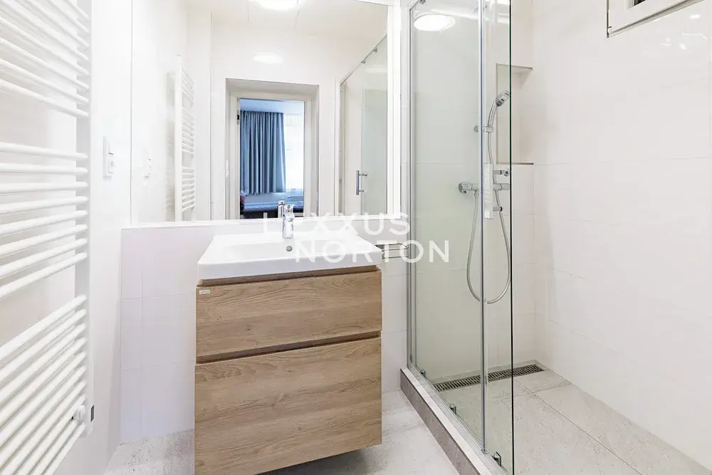 Kuchyňský kout je vybavený sklokeramickou varnou deskou, troubou, lednicí s mrazákem, myčkou nádobí a mikrovlnnou troubou. Koupelna disponuje sprchou. V bytě se nachází vestavěné skříně a úložné prostory, pračka se sušičkou. Vysoký standard provedení bytu dále skýtá k užívání vinylové plovoucí podlahy, velkoformátovou dlažbu, bezpečnostní vstupní dveře, žaluzie, plynový kotel, TV a alarm.
