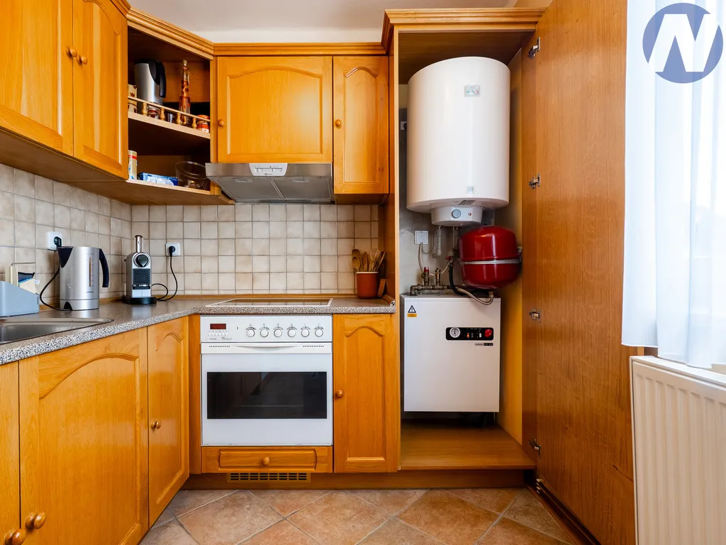 Součástí bytu je zděné bytové jádro s koupelnou vybavenou vanou a toaletou, které zajišťuje praktické a komfortní zázemí pro každodenní život. Velkou předností této nemovitosti je také prostorný sklep o výměře 7 m² a navíc sklepní kóje o ploše 2 m², díky nimž je k dispozici dostatek úložného prostoru. Vytápění bytu je zajištěno el. kotlem s rozvodem do radiátorů. Ohřev vody el. bojlerem.