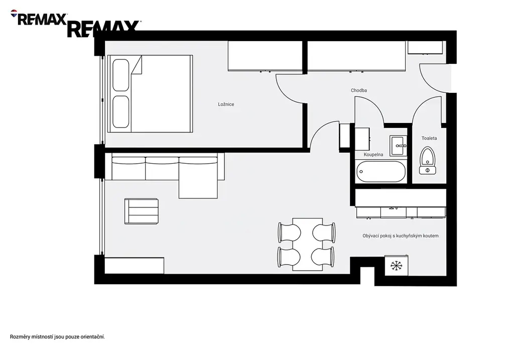 Dispozice bytu: obývací pokoj 18,2 m², ložnice 13,2 m², kuchyňský kout se spíží 4,5 m², předsíň 6,6 m², koupelna 1,9 m², samostatné WC 0,9 m² a komora 1,9 m².