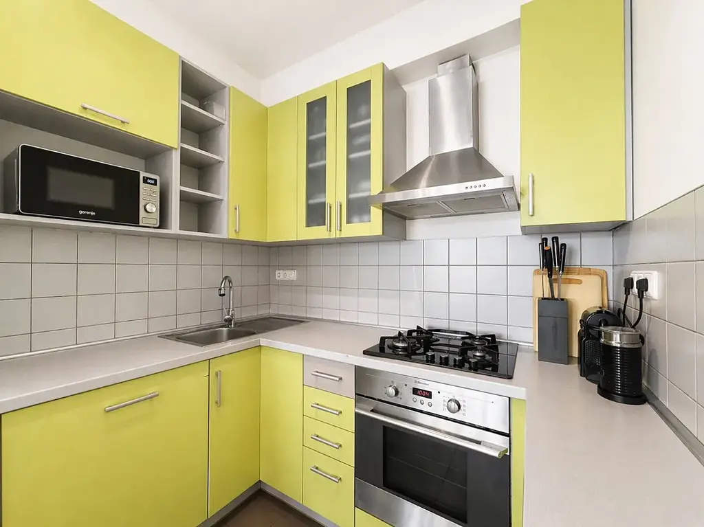 Byt disponuje obývacím pokojem s plně vybaveným kuchyňským koutem, který zahrnuje všechny potřebné spotřebiče. Dále jsou k dispozici dva samostatné pokoje, ideální jako ložnice, dětský pokoj nebo pracovna.