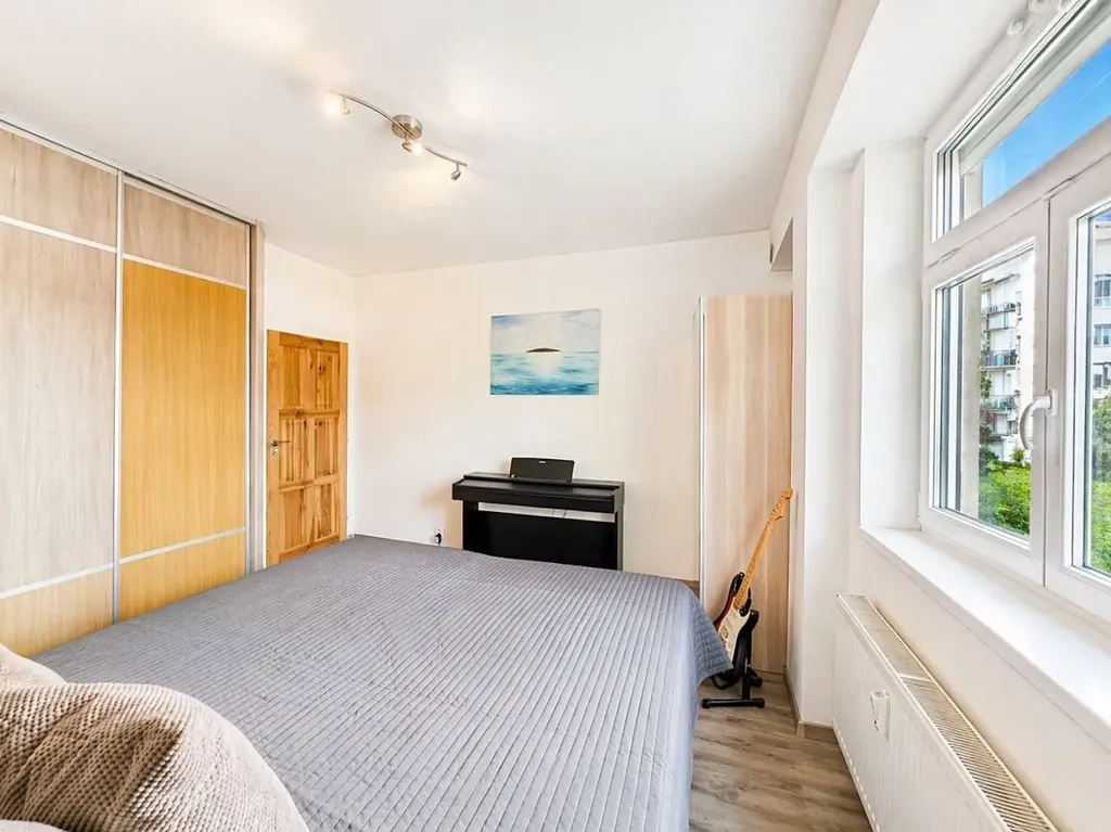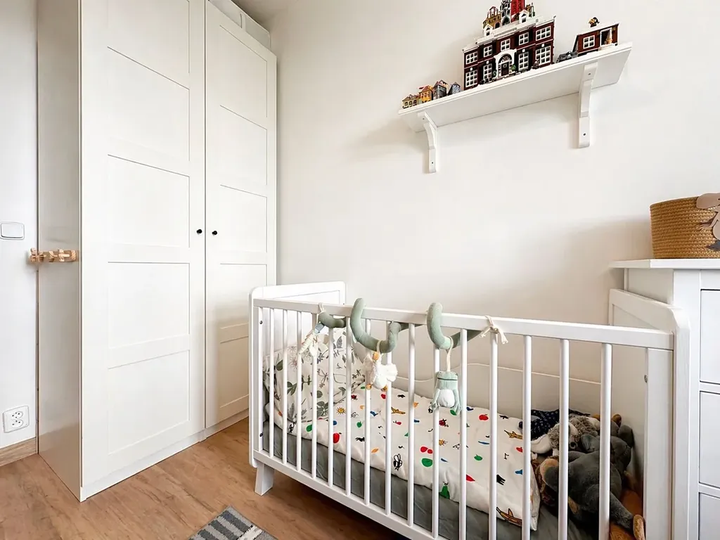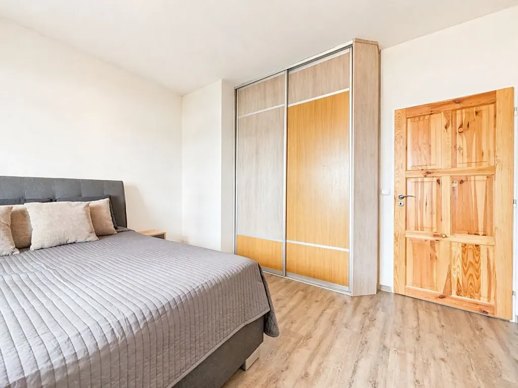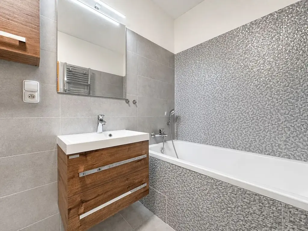 Velkým benefitem jsou vestavné skříně v chodbě i v obou pokojích, které poskytují dostatek úložného prostoru a přispívají k čistému a vzdušnému vzhledu interiéru. Moderní koupelna je vybavena vanou a toaletou. Je zde dostatek místa na pračku a sušičku.