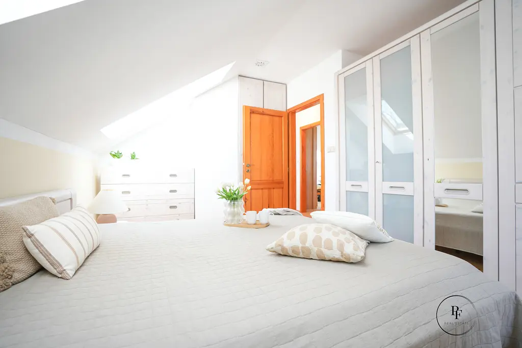 V horním podlaží se nachází klidová část domu se třemi ložnicemi, koupelnou a balkonem, ze kterého se otevírá krásný výhled do okolní krajiny. Právě pohled do zeleně a na hrad Bezděz jen podtrhuje výjimečnost této nemovitosti a dodává celému místu jedinečný charakter.