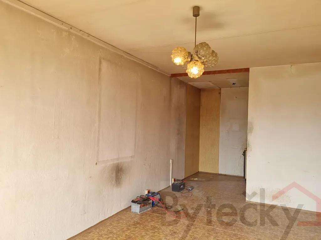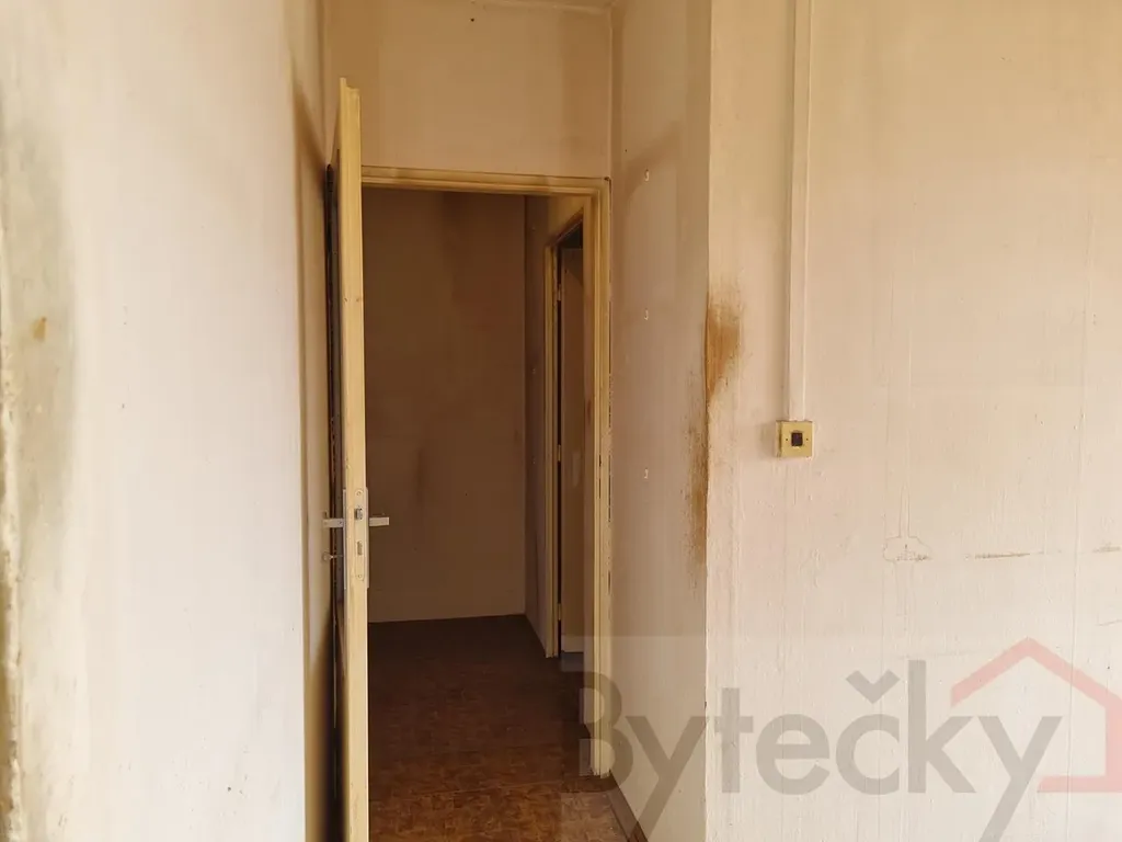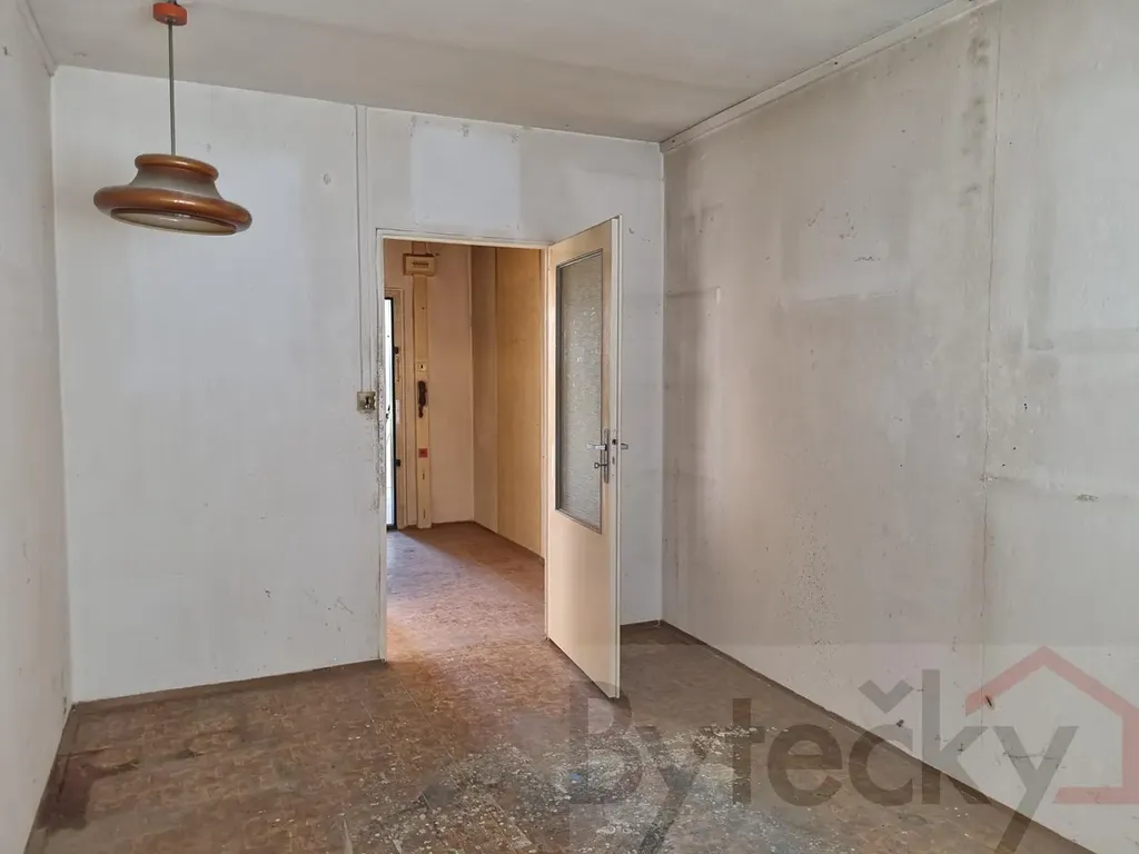 Byt je před kompletní rekonstrukcí. Byt je bez kuchyňské linky, staré původní vestavěné skříně nejsou a koupelnové jádro je umakartové původní (koupelna a wc mají samostatný vchod), původní je také rozvod elektřiny. V bytě není zaveden plyn. Dispozice bytu je velmi praktická: obývací pokoj má 17,93 m2+ kuchyňský kout 4,93 m², předsíň 5,78 m², ložnice 12,09 m², ložnice 10,26 m², předsíň 9,65 m², koupelna 2,14 m² a toaleta 1,03 m² = podlahová plocha bytu 43 m2 + sklepní kóje 4,8m2 (sklep umístěn v suterénu domu) = Celkem 47,8 m2.