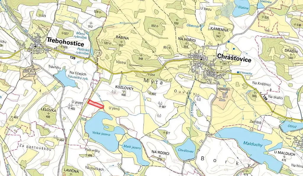 Pozemek se nachází v blízkosti Velkého jezera, jednou stranou je lemován jeho přítokem. Jedná se o rovinný pozemek.