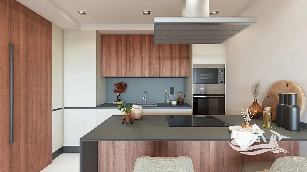 Interiér je navržen s důrazem na jednoduchou eleganci a funkčnost. Otevřený obývací prostor s kuchyní přirozeně navazuje na terasu a vytváří vzdušné prostředí plné světla. Kuchyň s poloostrovem je plně vybavena moderními spotřebiči a doplněna praktickými detaily, které oceníte při každodenním fungování. Vestavěné skříně, porcelánové podlahy a interiérové prvky v dekoru ořechu dodávají prostoru teplo a nadčasový charakter.