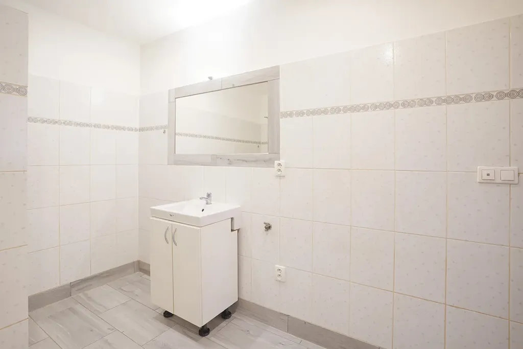 Bytová jednotka je v přízemí činžovního domu, je zde kuchyně s obývacím pokojem a ložnice je oddělena zdí. V koupelně najdeme sprchový kout, WC a umyvadlo, za koupelnou je technická místnost.