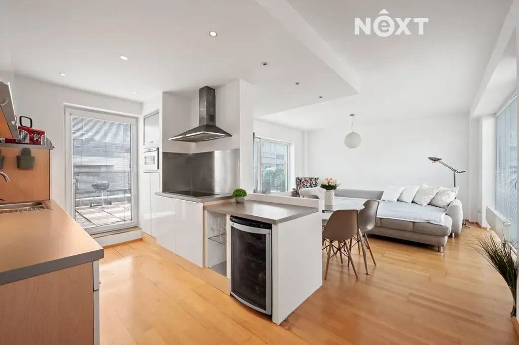 Srdcem bytu je prostorný obývací pokoj s plně vybavenou kuchyní, který díky velkoformátovým oknům na dvě světové strany působí mimořádně vzdušně a otevřeně.