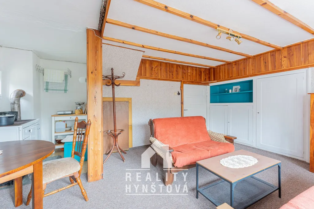 V přízemí je obývací pokoj s kuchyňkou, komora a vstup na terasu, kde se nachází i suchá toaleta. Po dřevěných schodech vystoupáte do obytného podkroví se dvěma pokoji. A pro uskladnění výpěstků poslouži sklep.