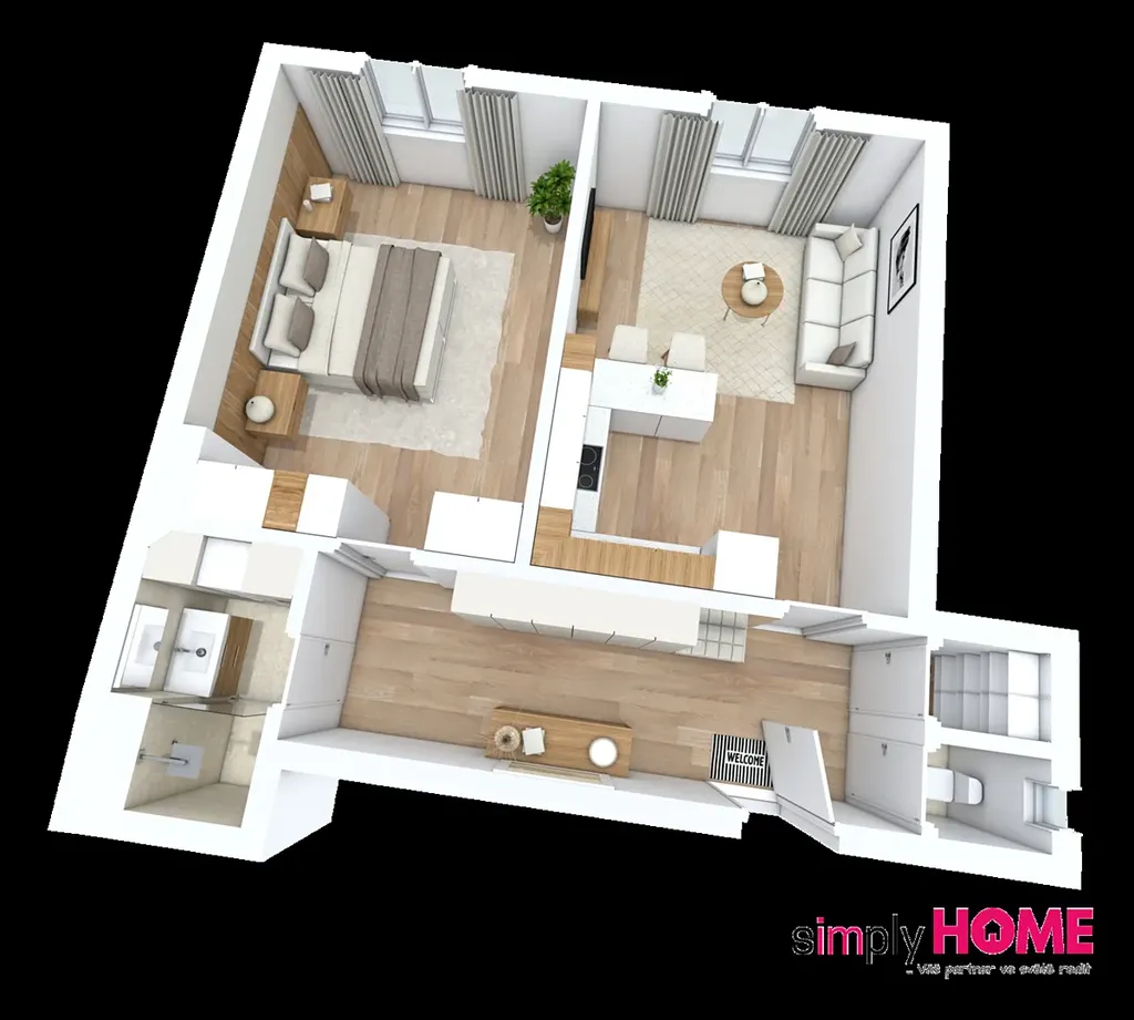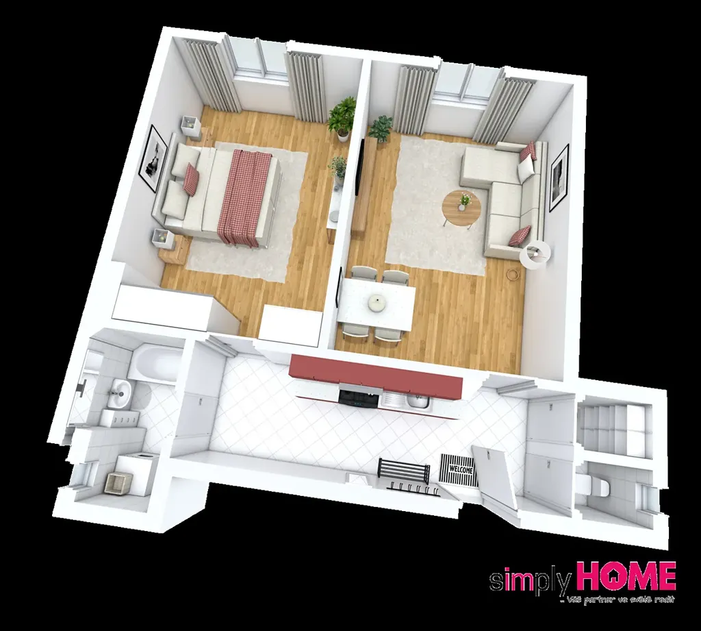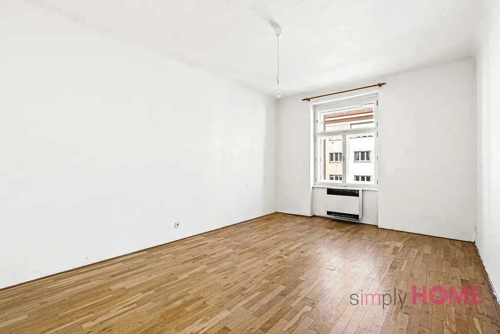 Celý byt je orientován na Severozápad do ulice Táborská a skládá se z předsíně s kuchyňským koutem, dvou neprůchozích pokojů, koupelny s vanou, komory a WC.