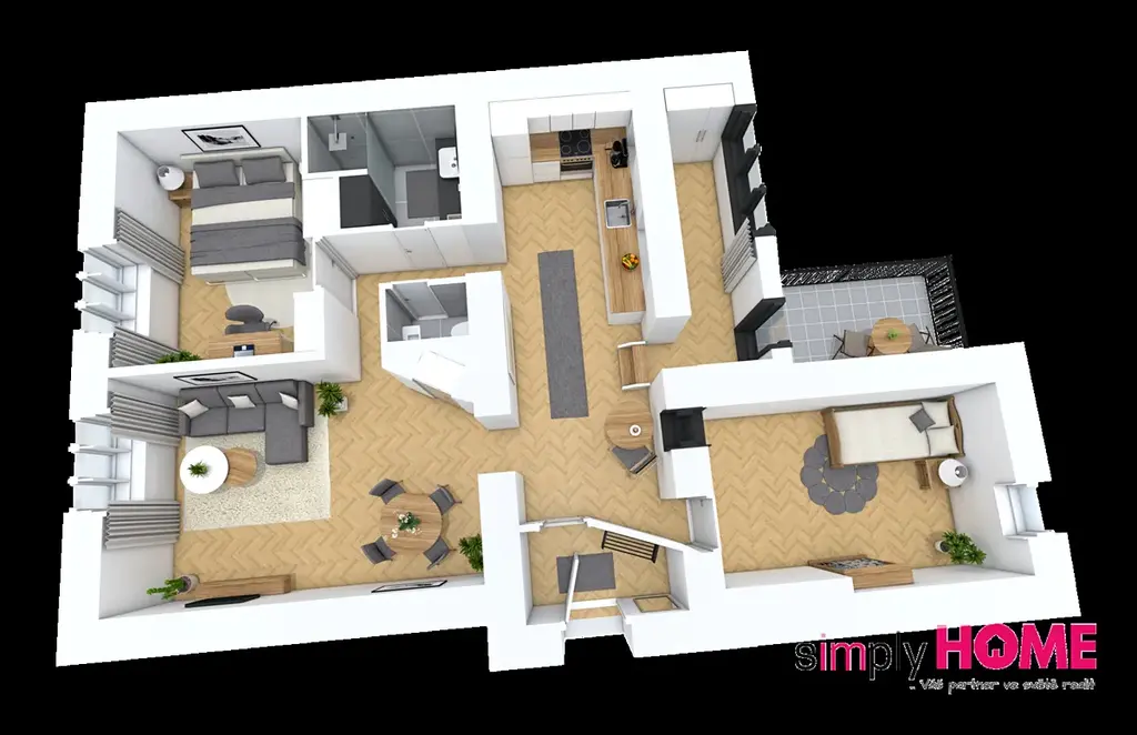 Byt se skládá ze vstupní haly s kompletně vybavenou kuchyňskou linkou a vstupem na terasu, obývacího pokoje, hlavní ložnice, druhé ložnice, koupelny se srpchovým koutem a WC. Klimatizační jednotky jsou v každé místnosti. Obývací pokoj a velká ložnice jsou orientovány na Jihovýchod do ulice Na Jezerce. Druhá ložnice, vstupní hala s kuchyňským koutem a terasou jsou orientovány Severozápadně do klidného vnitrobloku.