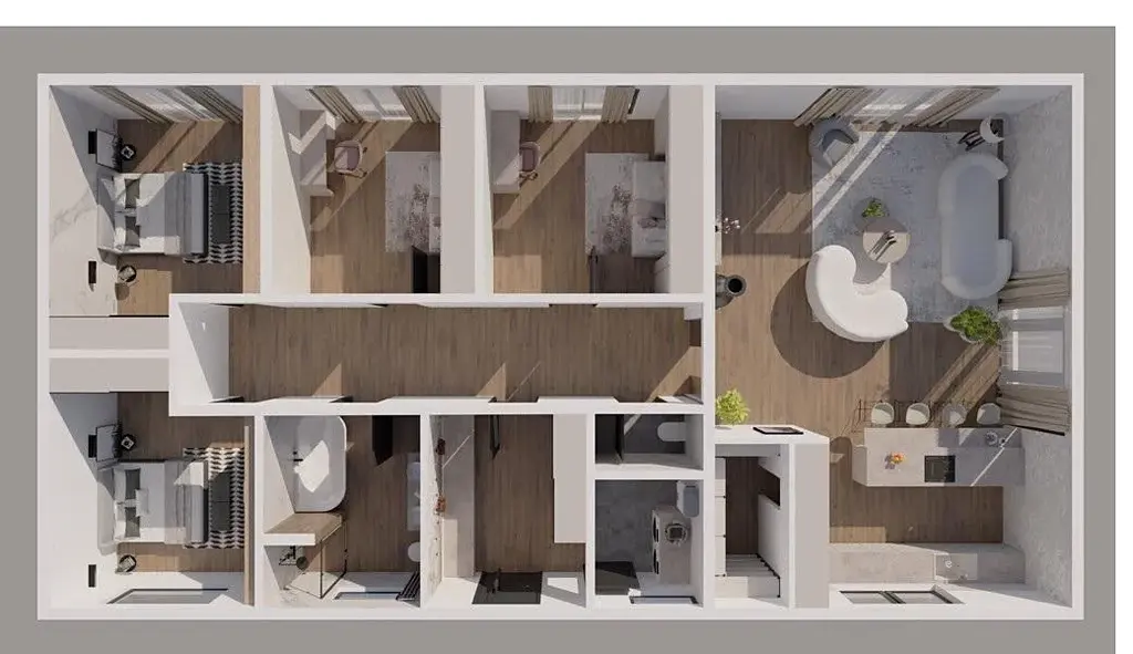 Žádné kompromisy: dvě plnohodnotné ložnice, dva dětské pokoje, velký obývák s kuchyní a komorou, koupelna, kde se ráno nepotkáte lokty, a terasa, na kterou vyjdete rovnou z obýváku i z ložnic. Všechno tu prostě dává smysl.