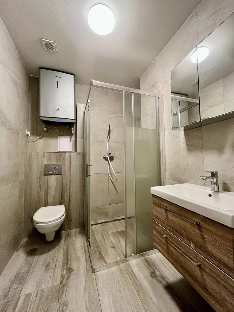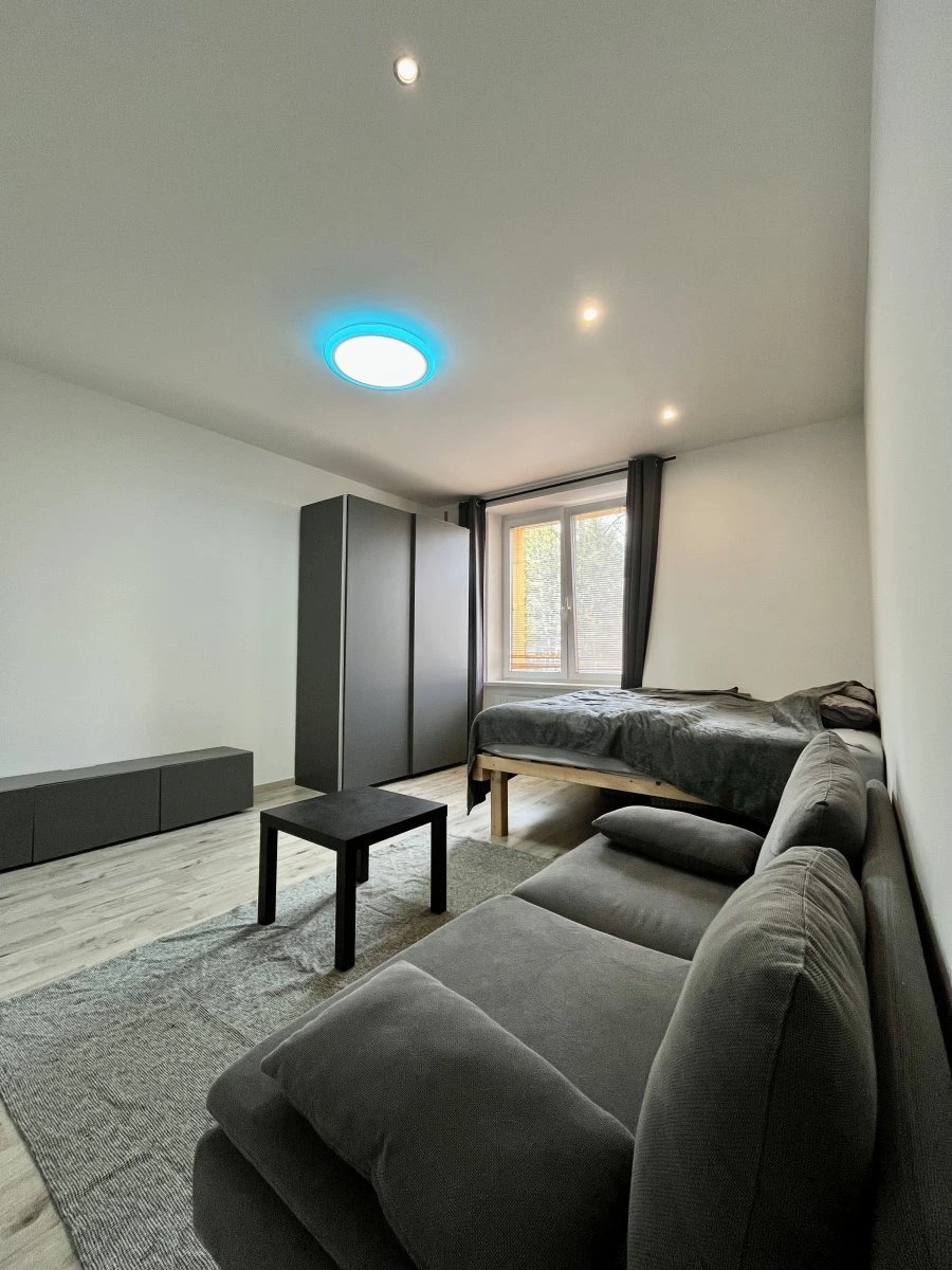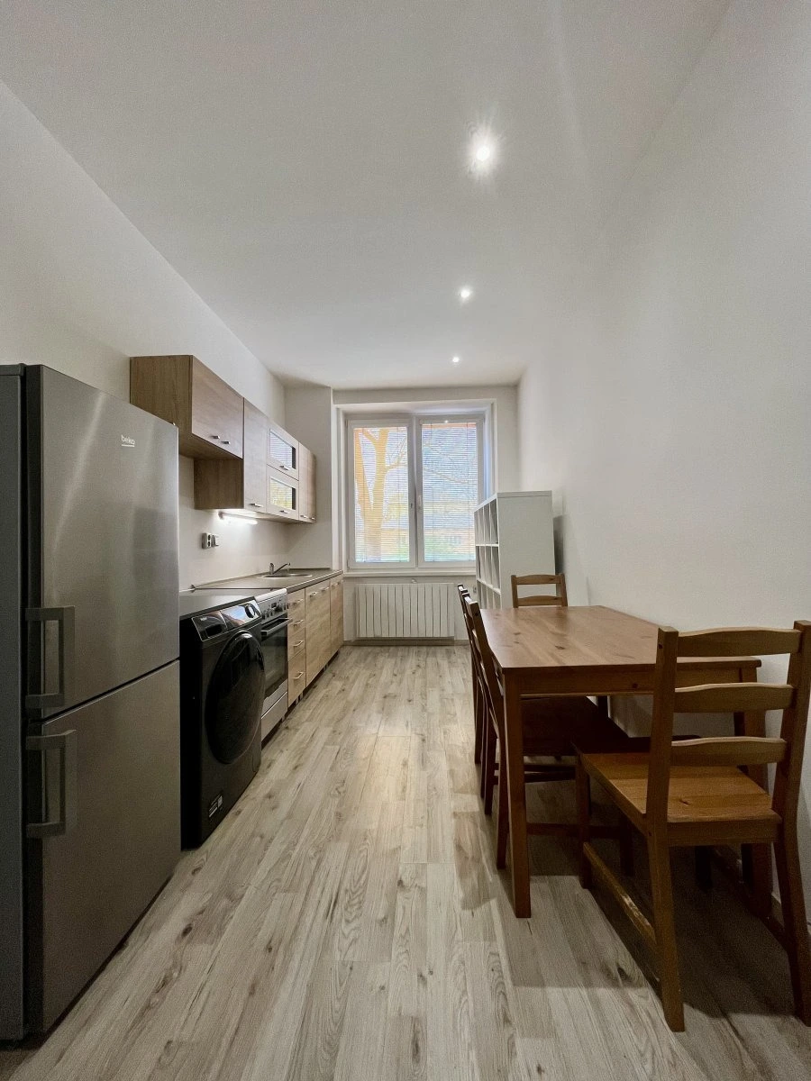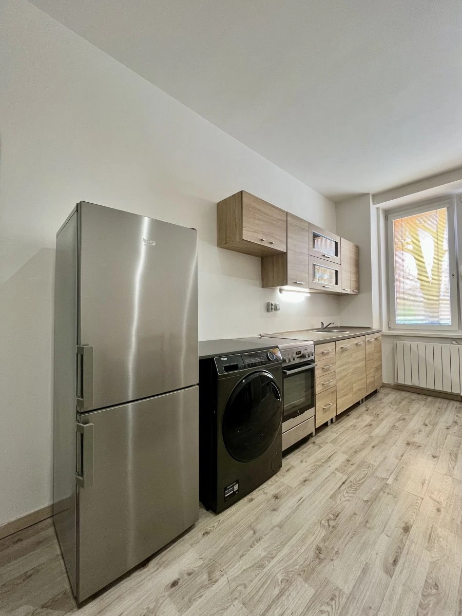 Byt se nachází v přízemí cihlového domu a jeho velkou výhodou je přístup ke společné zahradě, která nabízí příjemné místo k odpočinku. Interiér je plně vybavený, takže se můžete rovnou nastěhovat bez nutnosti dalších investic. Kuchyně disponuje elektrickým sporákem, troubou, lednicí i pračkou. V obytném pokoji najdete postel, šatní skříň, gauč i konferenční stolek – vše připravené pro pohodlné bydlení.