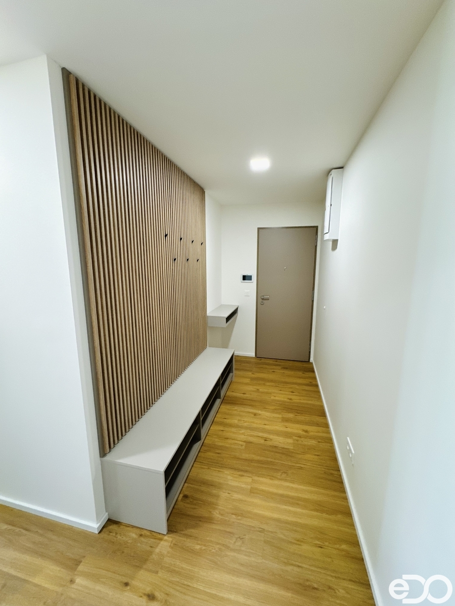 Byt se nachází v cihlové novostavbě a čeká na své první nájemníky. Moderní dispozice nabízí prostorný obývací pokoj s kuchyňským koutem, ložnici, předsíň, koupelnu s vanou a toaletou. Z obývacího pokoje i ložnice je vstup na lodžii o výměře 8,5 m², která poskytuje příjemné místo k relaxaci. Jednotka je orientována na jihovýchodní stranu. Součástí bytu je krásná a moderní kuchyňská linka, která je vybavena veškerými spotřebiči: elektrická trouba, indukční varná deska, digestoř, myčka a lednice s mrazákem. Součástí ložnice je krásná a stylová šatna, v předsíni je vestavěný botník s věšáky. Vytápění je zajištěno tepelným čerpadlem, stejně jako ohřev vody. Okna a dveře k lodžii jsou hliníková, podlaha pak vinyl a keramická dlažba. K bytové jednotce dále náleží zděný sklep (2,7 m²) a garážové stání, které je za příplatek 1 800 Kč měsíčně.