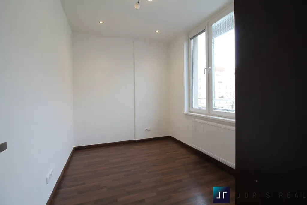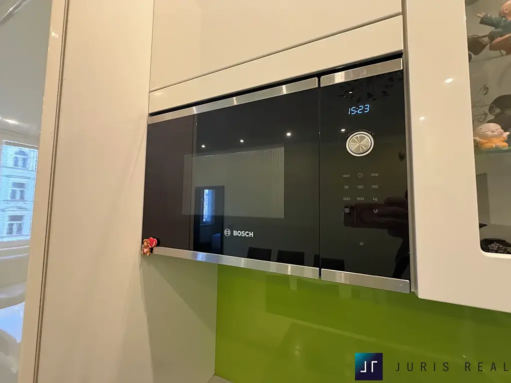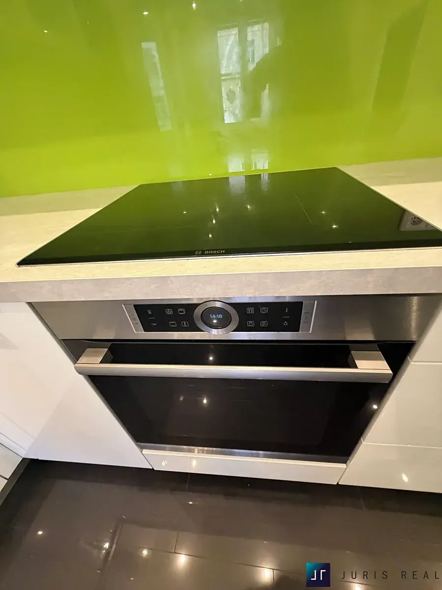 Dominantou bytu je světlý obývací prostor s moderní kuchyňskou linkou ve vysokém lesku, vybavenou vestavnými spotřebiči Bosch. Interiér působí velmi vzdušně díky jednotným dřevěným podlahám a promyšlenému dispozičnímu řešení. Prostor nabízí dostatek místa pro velkou sedací soupravu i jídelní část.