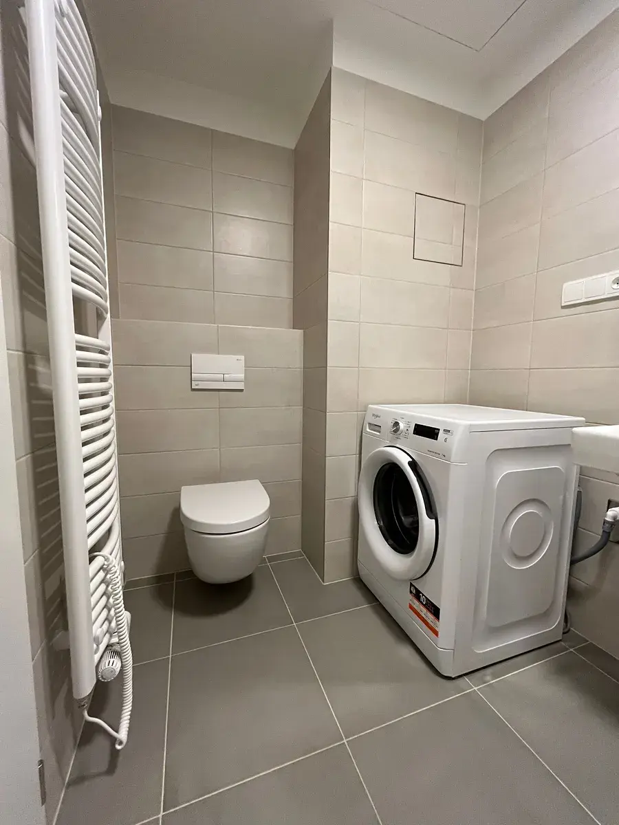 Prostorná koupelna je vybavena vanou, která má skleněnou zástěnu, dále topným žebříkem, velkým zrcadlem, pračkou a odděleným wc.
