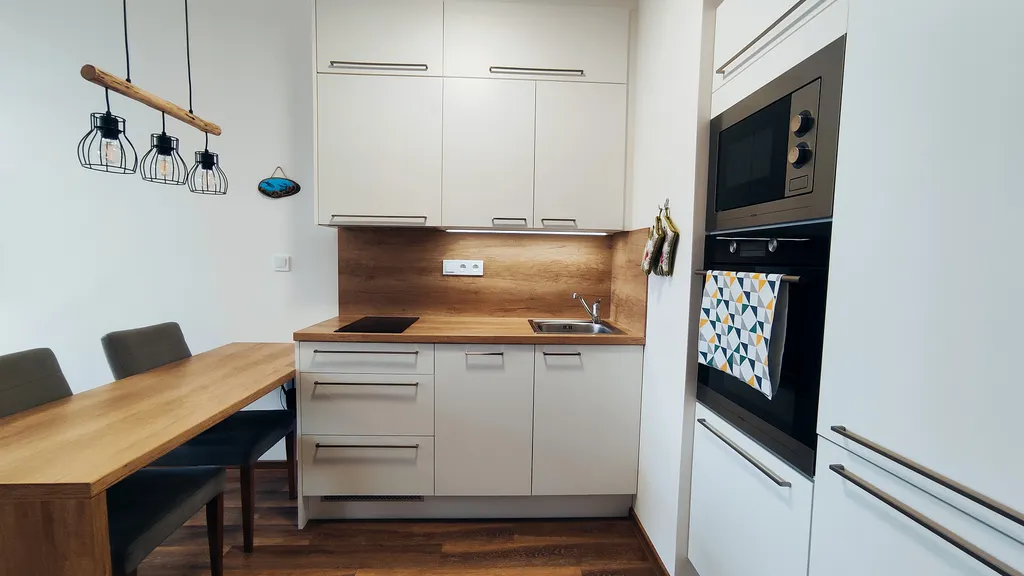 Byt je částečně vybaven, a to kuchyňskou linkou s vestavnou horkovzdušnou troubou, mikrovlnou troubu, vestavnou lednicí s mrazícím boxem, indukční varnou deskou, digestoří, myčkou nádobí a jídelním stolem se dvěma židlemi. Koupelna je vybavena prostorným sprchovým koutem, WC, umyvadlem se zrcadlem a pračkou s horním plněním. V chodbě je možné připojit sušičku prádla. Součástí bytu je i balkón o výměře cca 5 m², který je stejně jako okna orientován do vnitrobloku. V bytě je podlahové teplovodní vytápění, které v kombinaci s nízkou energetickou náročností budovy zajišťuje nízké provozní náklady. Přepis el. energie se na nájemce.