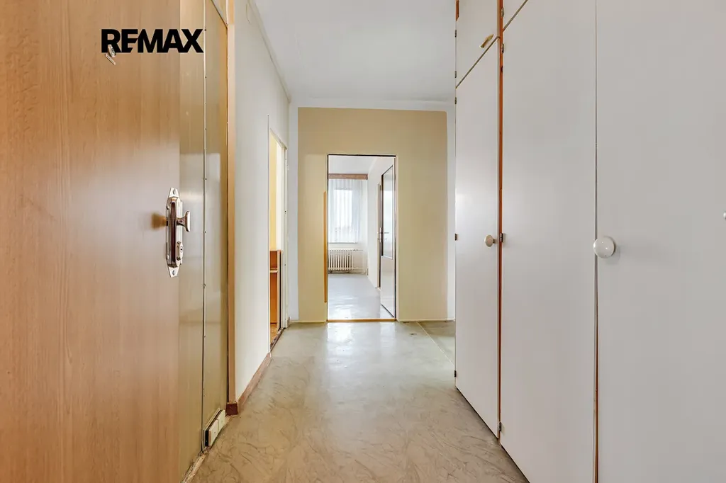 Dispozice bytu nabízí tři samostatné pokoje, kuchyňský kout s kuchyňskou linkou, koupelnu a samostatnou toaletu. Chodba poskytuje dostatek prostoru pro vestavěné skříně a další úložná řešení. Byt působí vzdušným a prosluněným dojmem.
